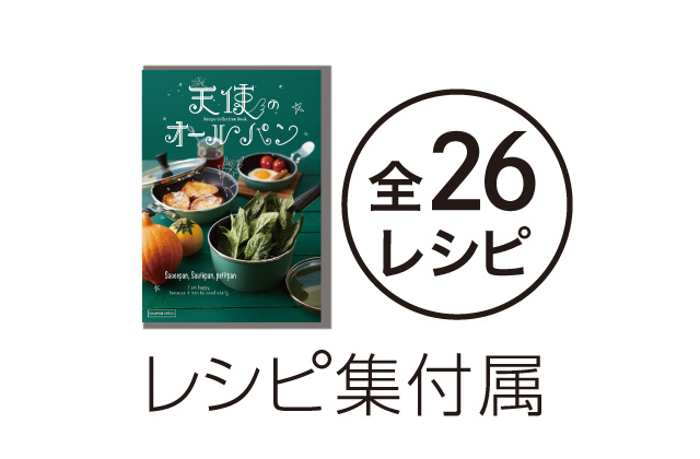 ここで紹介しているお料理はもちろん、「水ナシ?」・「油ナシ!」「プチ料理」全26レシピが掲載されたレシピ集付属。 届いたその日に天使のオールパンでお料理を楽しめます。